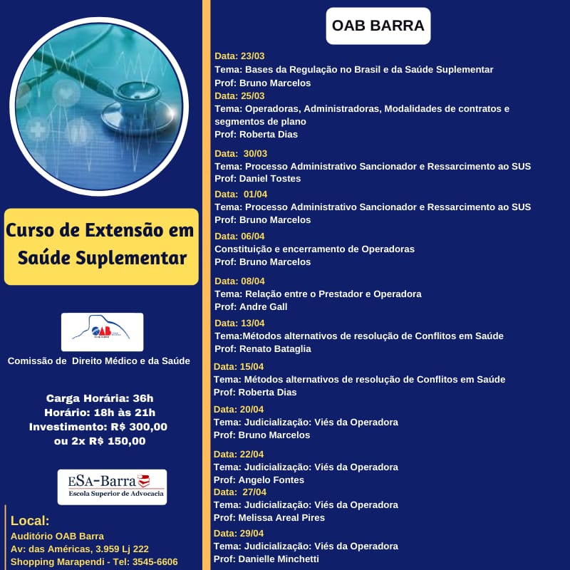 No próximo dia 23/03/2020, iniciarão as aulas do curso de extensão em saúde suplementar. O curso é uma iniciativa do Dr. Bruno Marcelos, e conta com a colaboração de professores especialistas em seus temas.